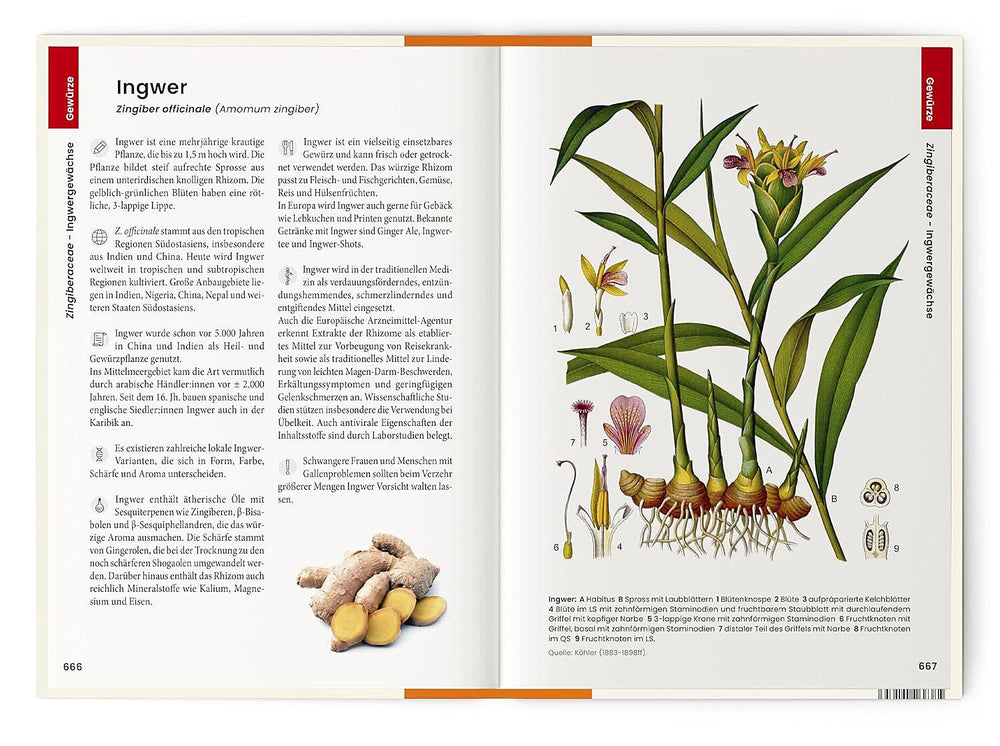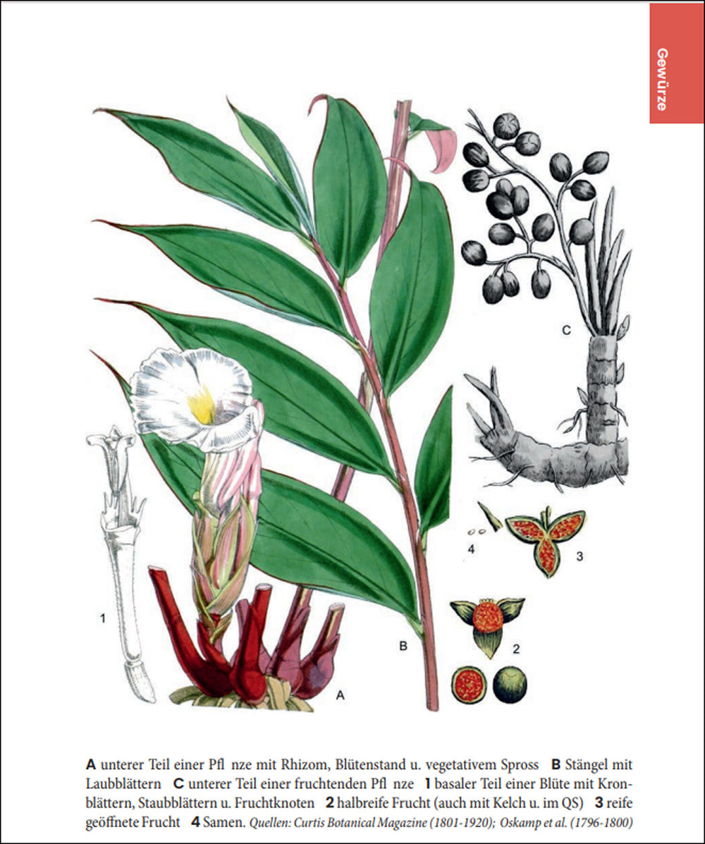- Große illustrierte Abbildungen mit Legende (wissenschaftlicher Name, Pflanzenfamilie, deutsche Pflanzennamen, Handelsnamen, Beschreibung der Vorkommen und Anbaugebiete.
